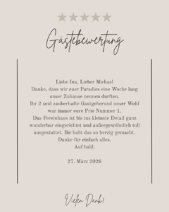 Bei Fragen stehen wir Ihnen sehr gerne jederzeit zur Verfügung. Wir werden uns sehr freuen, wenn Sie sich für den Aufenthalt in unserem Ferienhaus entscheiden.